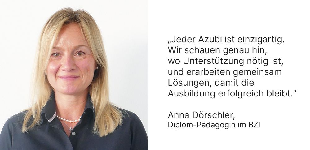 Darauf aufbauend werden feste gemeinsame Gesprächstermine während der Ausbildung vereinbart, unter anderem zum Ende der Probezeit und ca. zwei Monate vor dem Ausbildungsende im BZI. Zusätzlich steht ein regelmäßiges, offenes Gesprächsangebot zur Verfügung.